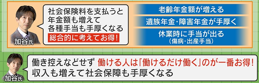 ただ、加谷氏によると、「社会保険料を支払うと年金額も増えて、各種手当も手厚くなるため、総合的に考えてお得」だということです。遺族年金・障害年金が手厚くなり、傷病・出産手当など休業時に手当が出るということで、手取りはマイナスになっても、一概に損とは言えません。加谷氏は、「働き控えなどせず、働ける人は『働けるだけ働く』のが一番お得!収入も増えて、社会保障も手厚くなる」と提言しています。