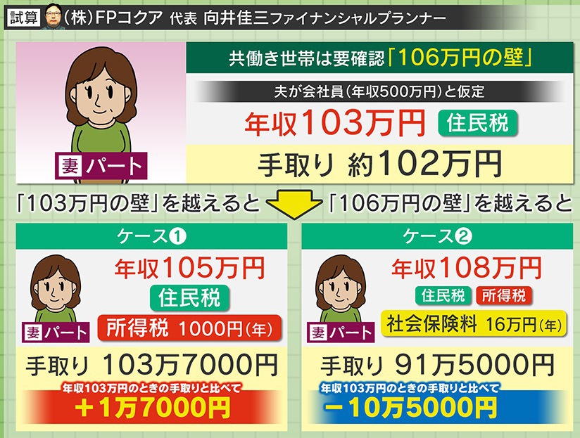 では、『社会保険の壁』を越えた時に手取りはどうなるか、(株)FPコクア代表・向井佳三ファイナンシャルプランナーが実際に試算しました。共働き世帯が確認すべきは、『106万円・130万円の壁』です。