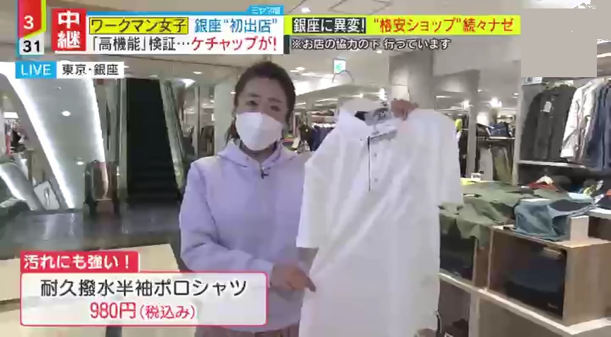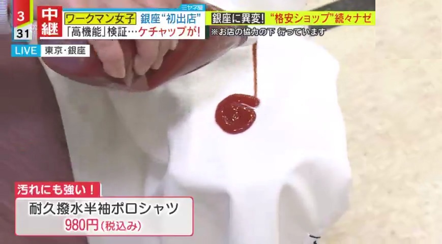 「さらにすごい商品を見つけました。こちらの白いポロシャツです。お値段は税込み980円で、コーヒー・醤油・油分もはじくそうなので、実験してみます。この家から持ってきたケチャップを付けても…