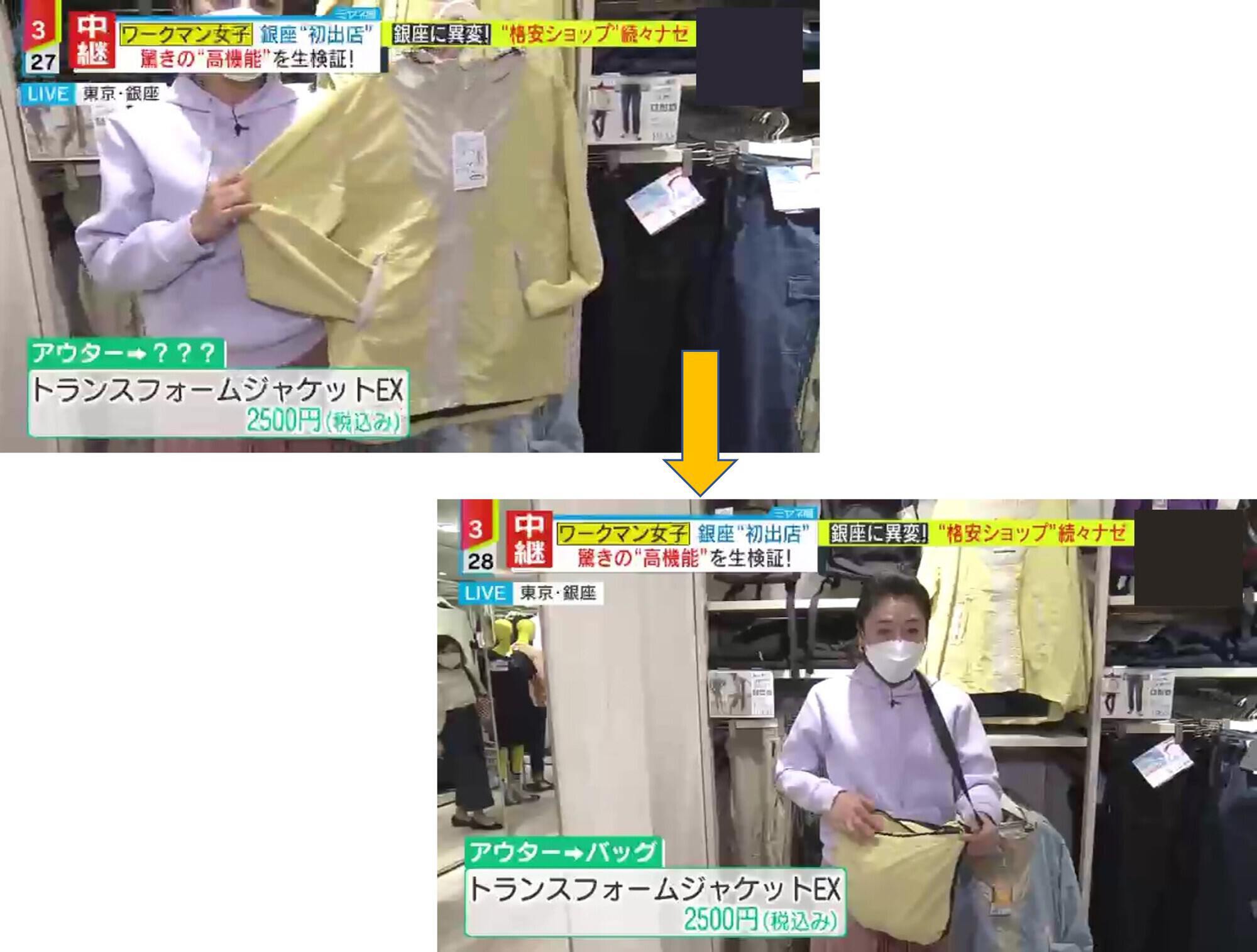 「ここからは、UVカット・紫外線対策が施された洋服のコーナーです。このアウターが全部1000円台です!そして、私がぜひとも紹介したい商品が、こちら『トランスフォームジャケットEX』。税込み2500円のかわいい黄色のアウターですが、なんとA4サイズの書類が入る鞄に変身するんです」