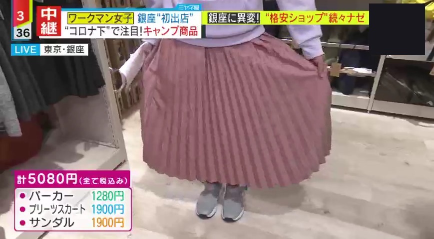 「私の着ている服も『#ワークマン女子』でコーディネートしたもので、撥水加工のプリーツスカートとパーカーサンダルまで合わせて税込み5080円です。まだアウトドアをテーマにした男性用のコーディネートもあります」