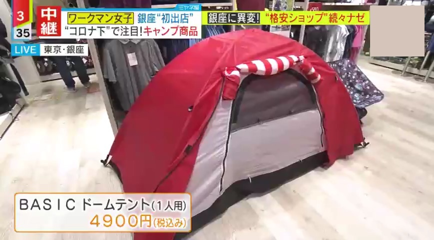「ワークマンでは、キャンプ用品の取り扱いも始め大変な人気となっています。寝袋やテントなどずらりと並んでいますが、中でも1番人気が、こちらの一人用のテント税込み4900円です!安いの、でキャンプ初心者にとって非常にありがたいです」