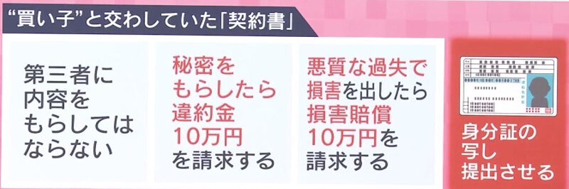 男(25)は、“買い子”と契約書を交わしていました。そこには、「第三者に内容をもらしてはならない」「秘密をもらしたら、違約金10万円を請求する」「悪質な過失で損害を出したら、損害賠償10万円を請求する」といった内容が記載されていて、事前に身分証の写しを提出させていたということです。