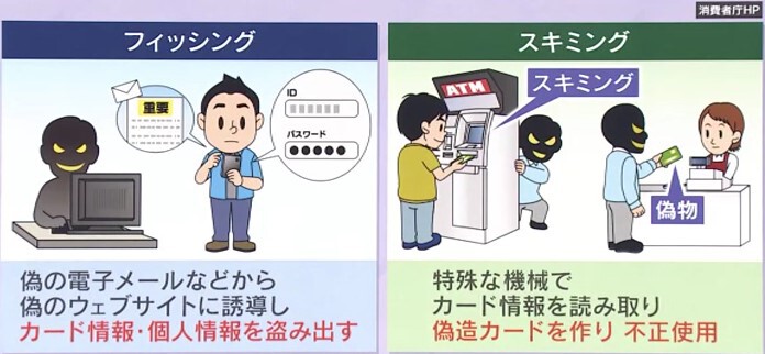 カード情報を盗み出す主な手口は、偽の電子メールなどから偽のウェブサイトに誘導し、カード情報・個人情報を盗み出す「フィッシング」、そして、特殊な機械でカード情報を読み取り、偽造カードを作って不正使用する「スキミング」があります。
