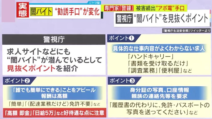 こちらの何気ない投稿に向こうからコンタクトを取ってくるということですが、警視庁が“闇バイト”を見抜くポイントを3つ紹介しています。