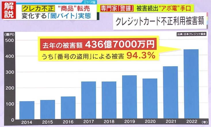 2022年のクレジットカード不正利用被害額は436億7000万円で、うち94.3%が「番号の盗用」による被害でした。