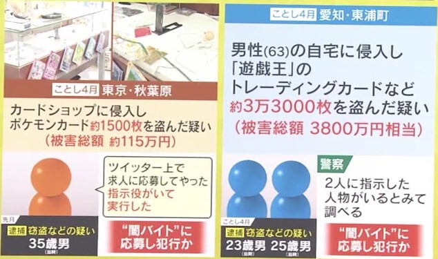 また、強盗のターゲットも貴金属から別の物に移行しているといいます。2023年4月、東京・秋葉原のカードショップに侵入し、ポケモンカード約1500枚を盗んだ疑いで、35歳の男が逮捕されました。被害総額は115万円で、「指示役がいて実行した」と供述しているということです。さらに愛知・東浦町では、63歳の男性宅に侵入し、「遊戯王」のトレーディングカードなど約3万3000枚(被害総額3800万円相当)を盗んだ疑いで、23歳と25歳の男が逮捕されました。警察は、“闇バイト”による犯行を疑い、2人に指示した人物がいるとみて調べています。