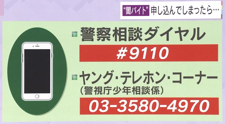 もし“闇バイト”に申し込んでしまったら、警察相談ダイヤル「#9110」または、警視庁少年相談係のヤング・テレホン・コーナー「03-3580-4970」に電話してください。