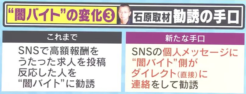 “闇バイト”への勧誘の手口も変化しています。これまでは、高額報酬をうたった求人をSNSに投稿し、それに反応した人を闇バイトに誘っていくものでした。