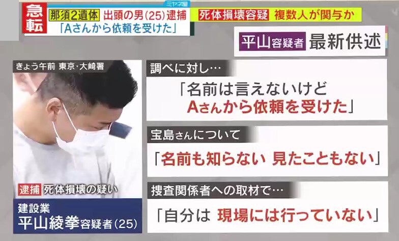 平山容疑者は調べに対し、「名前は言えないけど、Aさんから依頼を受けた」、宝島さんについては「名前も知らない、見たこともない」と話しているということです。捜査関係者への取材で、「自分は現場には行っていない」と供述していることも新たに判明しました。