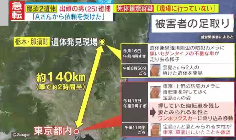 遺体発見の前日である4月15日午後9時すぎ、東京・上野の防犯カメラに、自転車を押して歩く宝島さんの姿が映っていたといいます。この直後、押していた自転車を残し、何者かが運転するワンボックスカーに、妻とみられる女性と乗り込んでいたことが判明。また、午後11時半ごろまで東京・東品川にいたことも確認されています。
