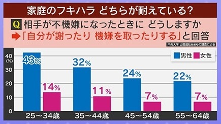 家族社会学の専門家である『中央大学』山田昌弘教授らの調査によると、「相手が不機嫌になった時どうしますか?」という質問に対し、「自分が謝ったり機嫌を取ったりする」と回答したのは、25~64歳の全世代で男性のほうが多いという結果になりました。中でも、若い男性(25~34歳)の43%が率先して妻に頭を下げていることが判明。一方、最も少なかったのは45~64歳の女性で、7%だったということです。