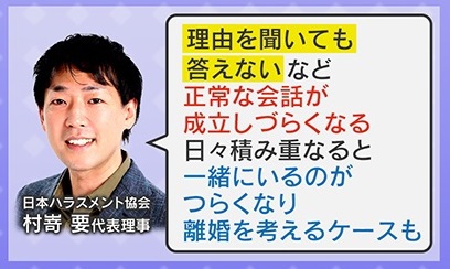 『日本ハラスメント協会』村嵜要代表理事は、「理由を聞いても答えないなど、正常な会話が成立しづらくなる。日々積み重なると、一緒にいるのがつらくなり、離婚を考えるケースも」と話しています。