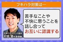 フキハラ対策について、日本ハラスメント協会・村嵜代表理事は、「苦手なことや不快に思うことを話し合って、お互いに認識する」との見解を示しています。