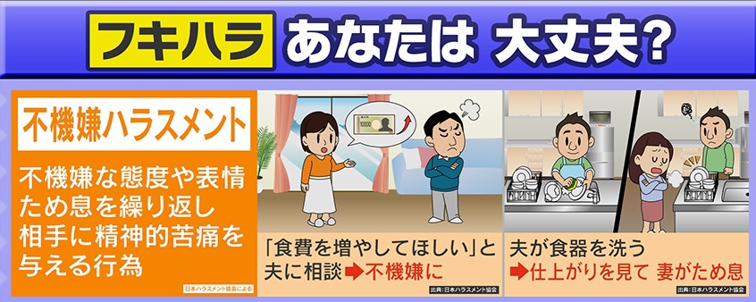 不機嫌な態度やため息などで相手に精神的苦痛を与える行為、『不機嫌ハラスメント(フキハラ)』。夫婦間でもよく起こる現象ですが、実は夫が先に謝る割合は妻の約3倍とのデータが。なぜ、世の夫たちは率先して妻に頭を下げるのか?そして、妻の機嫌を取るための涙ぐましい“テクニック”とは―。