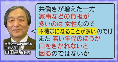 この結果に、調査を行った山田教授は、「共働きが増えた一方、家事などの負担が多いのは女性なので、不機嫌になることが多いのでは。また、若い年代のほうが口をきかれないと困るのではないか」と分析しています。