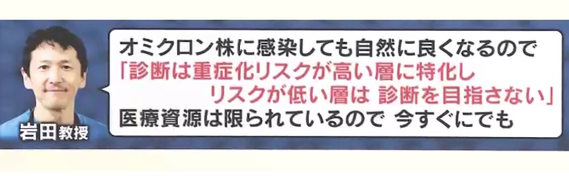 Q岩田教授は、医療逼迫を防ぐため、診断は重症化リスクが高い層に特化し、リスクが低い層は診断を目指さない、医療資源は限られているので、今すぐにでも対応すべきだ。とおっしゃっていますが、詳しくはどういうことでしょうか?