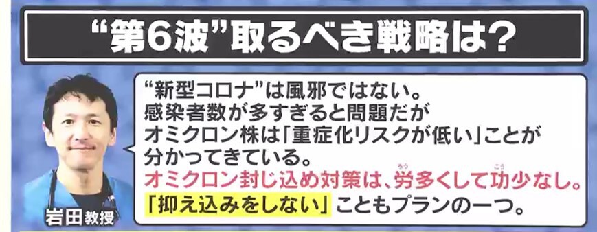 「イギリスがこういう、オミクロン株の感染者増大は許容している、というのは、3回目のワクチン接種などで、もっと怖いリスク、死亡者が非常に増えるとか、そういったところを予防することを同時進行でやっている。好きなようにしろと言っているわけじゃない。日本は2回目までのワクチン接種で非常にスピーディーにやったのに、なぜか3回目の接種から非常にブレーキがかかってスピードがダウンしてしまいました。ここが最大のネックで、ここをちゃんと克服しない限りは、私がさっき申し上げた抑え込みをしない、というような大胆な策っていうのはなかなかしづらい」
