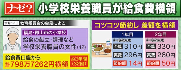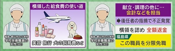 この女性職員は献立・調理の他に会計なども全て担当していて、今回、後任者の指摘で不正が発覚しました。横領した給食費は美容・旅行・犬の飼育費などに使っていたということで、女性職員は横領を認め、全額返金。福島県は、この職員を分限免職にしました。