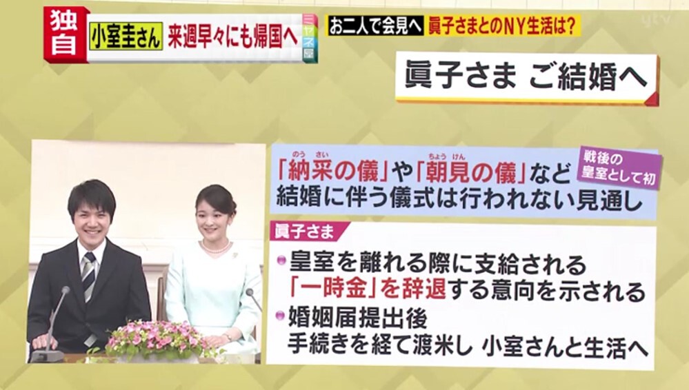 『納采の儀』や『朝見の儀』などといった結婚に伴う儀式は行われない見通しで、これは戦後の皇室としては初めてのこととなります。眞子さまは一時金を辞退する意向を示されていて、婚姻届提出の手続きを経てアメリカに渡り、小室さんと生活をされる見通しです。