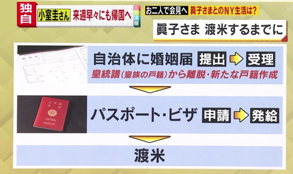 眞子様は渡米されるまでに、自治体に婚姻届を提出。皇統譜(皇族の戸籍)から離脱し、新たな戸籍を作成する必要があります。その後、パスポートとビザを申請し、発給された後にアメリカに渡ることとなります。