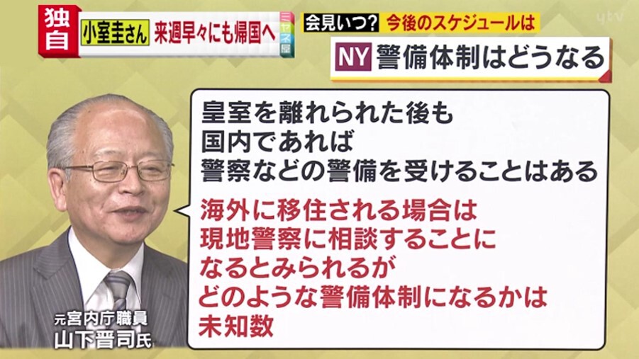 山下さんによると、警備体制については皇室を離れられたあとも、国内であれば警察などの警備を受けることはあるが、海外に移住される場合は現地警察に相談することになるとみられるが、どのような警備体制になるかは未知数だということです。