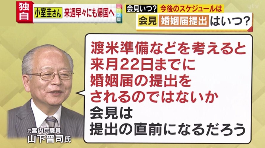 山下さんによると、アメリカに渡る準備などを考えると10月22日までに婚姻届の提出をされるのではないか、そして会見は提出の直前になるだろうということです。