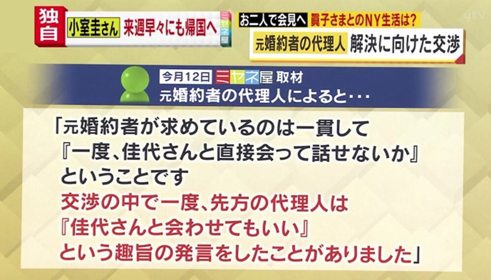 金銭トラブル解決に向けた交渉について、9月12日に番組が小室さんの母・佳代さんの元婚約者の代理人に取材をしたところ、元婚約者が求めているのは、一貫して、佳代さんと直接会って話せないかということです。交渉の中で一度、先方の代理人は佳代さんと会わせてもいいという趣旨の発言をしたことがあったということです。