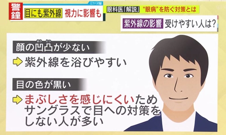 一般的に顔の凹凸が少ない人は紫外線を浴びやすい傾向にあります。個人差はありますが、欧米人よりも東洋人、特に日本人は紫外線を浴びやすいということです。さらに、目の色が黒いとまぶしさを感じにくい傾向があり、サングラスで目への対策をしない人が多いため、紫外線の影響を受けやすいのです。