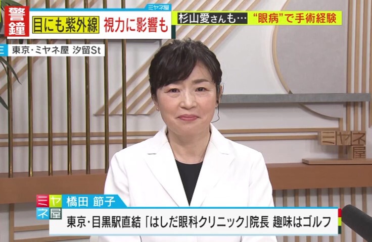 6月6日、関東・甲信地方は平年より1日早く梅雨入りし、天気の悪い日が続くこの時期でも油断できないのが“紫外線”です。そして、実は気を付けなければならないのが“目から入る紫外線”。「ドライアイ」や「視力障害」など、様々な「眼病」を引き起こすダメージを与える上、目から入った紫外線が原因で、肌が黒くなったりシミができてしまうという「目肌焼け」の原因にも…!大切な目を紫外線から守るための対策を、はしだ眼科クリニックの橋田節子院長が解説します。
