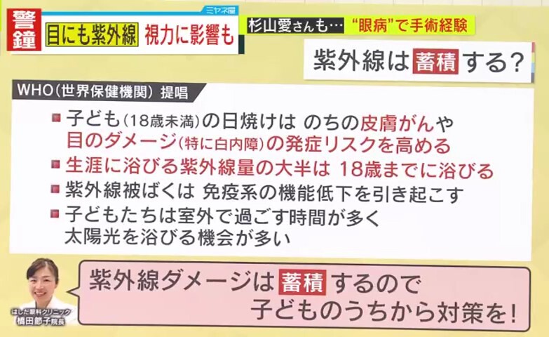 WHO(世界保健機関)の発表では、子ども(18歳未満)の日焼けは、のちの皮膚がんや目のダメージ、特に白内障の発症リスクを高めるとしています。さらに、子ども達は室外で過ごす時間が多いため太陽光を浴びる機会が多く、生涯に浴びる紫外線量の大半は18歳までに浴びるということなのです。橋田院長によると、紫外線ダメージは“蓄積”するので、子どものうちから対策をする必要があるということです。