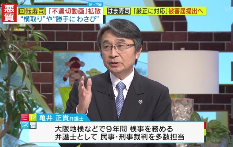 回転寿司店で、他の客が頼んだ寿司の皿に“勝手にわさびを載せる”などの迷惑行為を撮影した「不適切動画」がネット上に拡散し、批判が殺到しています。回転寿司チェーン「はま寿司」は、許されざる行為として、警察に被害届を出すことを明かしました。「犯罪」にもなり得る悪質行為について、元大阪地検検事の亀井正貴弁護士が解説します。