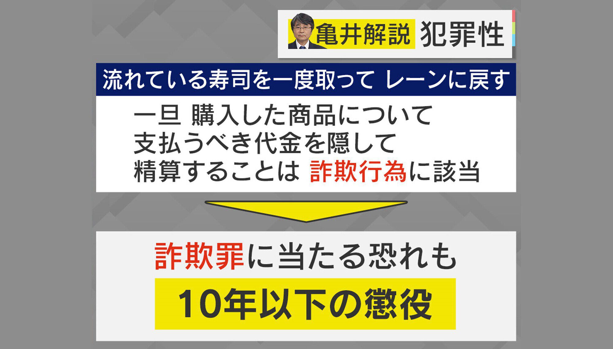 また、“流れている寿司を一度取ってレーンに戻す行為”は、一旦購入した商品に対し、支払うべき代金を隠して精算するという詐欺行為に該当し、「詐欺罪」当たる恐れがあるということです。「詐欺罪」は10年以下の懲役になります。
