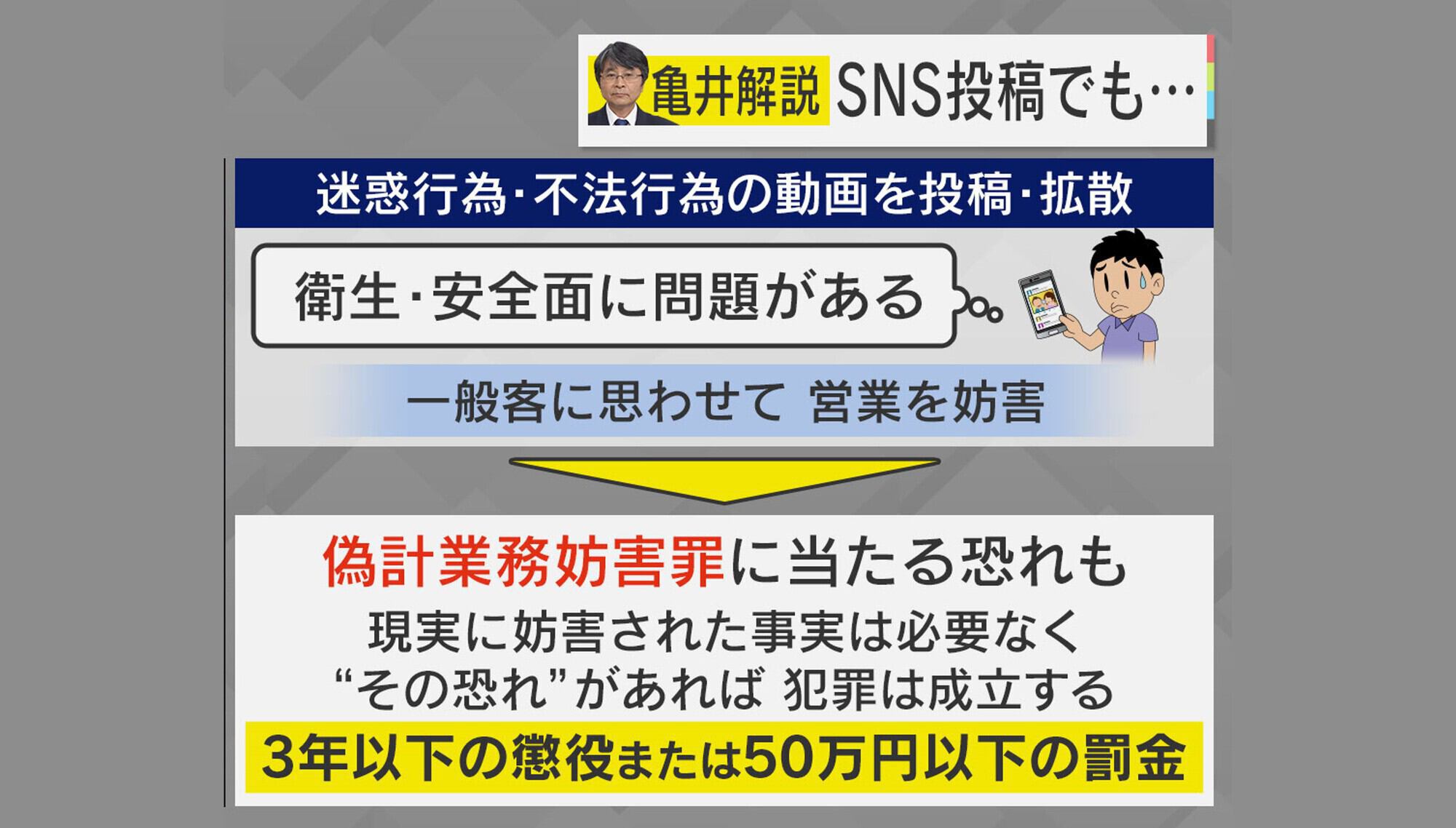 そして、迷惑行為・不法行為の動画をSNSに投稿・拡散する行為自体も、「衛生・安全面に問題がある」と一般客に思わせて営業を妨害する、「偽計業務妨害罪」に当たる恐れがあります。「偽計業務妨害罪」は、現実に妨害された事実は必要なく、“その恐れ”があれば犯罪は成立し、3年以下の懲役または50万円以下の罰金になります。