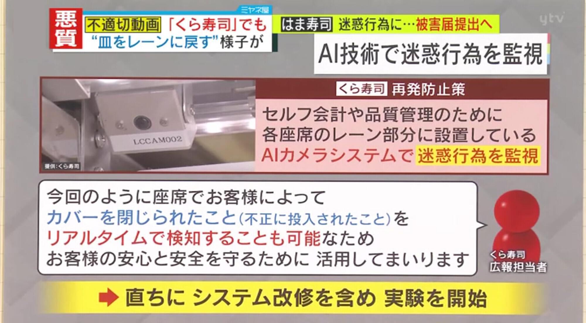 「くら寿司」は再発防止策として、セルフ会計や品質管理のために各座席に設置している「AIカメラシステム」で迷惑行為を監視できるよう、直ちにシステムの改修を含め実験を開始するということです。広報担当者は「今回のように、座席でお客様によってカバーを閉じられたこと(不正に投入されたこと)をリアルタイムで検知することも可能なため、お客様の安心と安全を守るため活用してまいります」と話しています。
