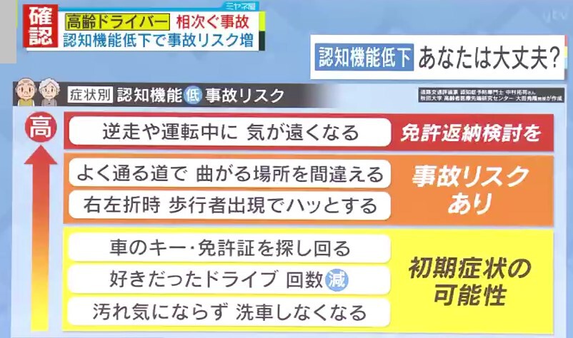 道路交通評論家・中村氏らが作成した『症状別 認知機能低下・事故リスク』の指標によると、“車のキー・免許証を探し回る”“好きだったドライブの回数が減る”“汚れが気にならず洗車しなくなる”といった症状の人は『初期症状の可能性』、“よく通る道で曲がる場所を間違える”“右左折時、歩行者出現でハッとする”といった症状がある人は『事故リスクあり』、“逆走や、運転中に気が遠くなる”といった症状がある人は『免許返納の検討を』となっています。
