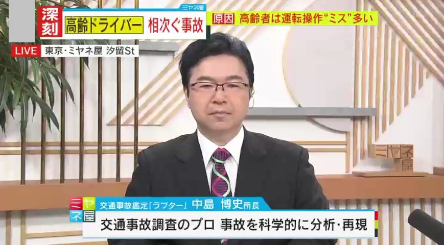 相次ぐ高齢ドライバーによる交通事故。中でも多いのが、アクセルとブレーキの“踏み間違い”。また、年間に約200件起きるという“高速道路逆走”の約7割が高齢者との報告も…。他人事ではない“事故に繋がりやすい運転操作”とは?事故を防ぐため推奨される“後付け機器”とは?免許返納を検討すべき“認知機能レベル”とは?交通事故鑑定人・中島博史氏の解説です。
