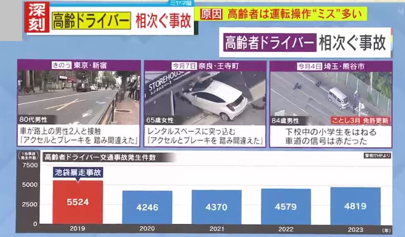 2019年に起きた“池袋暴走事故”以降、高齢ドライバーの交通事故発生件数は減少傾向にありましたが、コロナ禍が明けたこともあるためか、徐々に増えています。2024年6月11日には東京で、80代の男性が運転する車が暴走して2人がケガ。また、この3日前には奈良県で、65歳の女性が運転する車がレンタルスペースに突っ込む事故が発生。さらに、その3日前には埼玉県で、84歳の男性が運転する車が小学生の列に突っ込むなど、相次ぐ高齢者の事故。このうち、東京の80代男性と奈良の65歳女性が「ブレーキとアクセルを踏み間違えた」と供述しています。