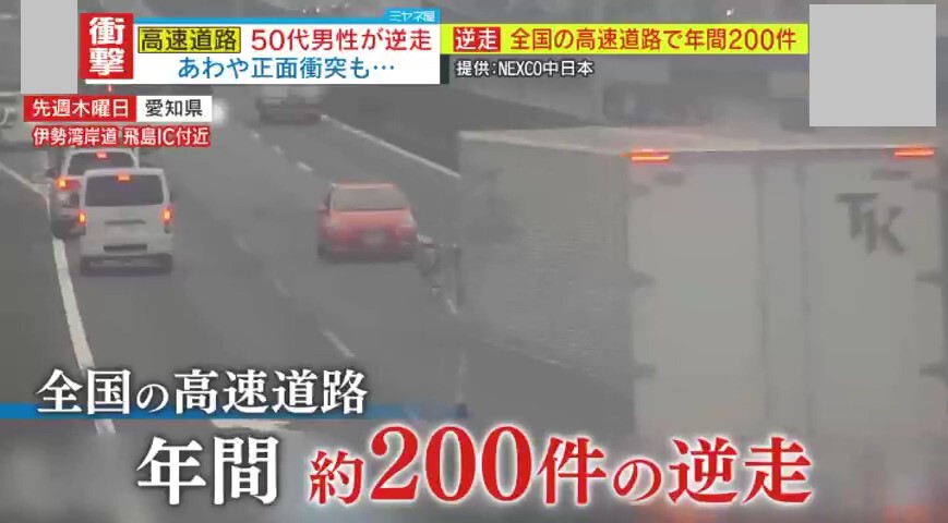 2024年6月6日にも、愛知県の伊勢湾岸自動車道・飛鳥IC付近で、逆走車が映像に捉えられました。3車線の真ん中を走り続ける逆走車に、慌てて車線変更する車も…。1kmほど逆走し、大型トラックとあわや正面衝突といった場面で停車しました。しかし、約10秒後に到着した高速道路交通警察隊が交通誘導しようとすると、再び逆走。慌てて追いかけた隊員は逆走車の運転席に乗り込み、車を正しい方向に戻しました。