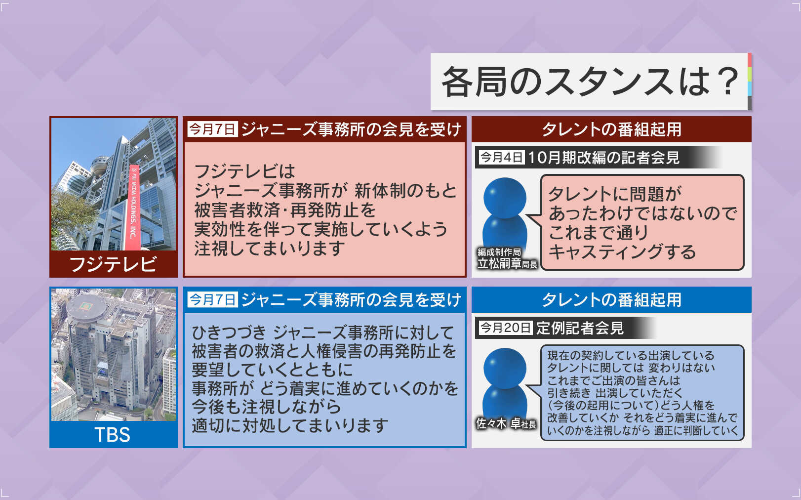 9月7日の会見を受けた民放各局の対応です。フジテレビは「ジャニーズ事務所が新体制のもと、被害者救済・再発防止を実効性を伴って実施していくよう注視してまいります」としています。タレントの起用については「タレントに問題があったわけではないので、これまで通りキャスティングする」とのことです。TBSは「ひきつづきジャニーズ事務所に対して被害者の救済と人権侵害の再発防止を要望していくとともに、事務所がどう着実に進めていくのかを今後も注視しながら対処してまいります」とコメントしています。またタレントの寄与に対しては「現在、契約・出演しているタレントに関しては、変わりはない。これまでご出演の皆さんは引き続き、出演していただく。(今後の起用について) どう人権を改善していくか、それをどう着実に進んでいくのかを注視しながら適正に判断していく」とのことです。