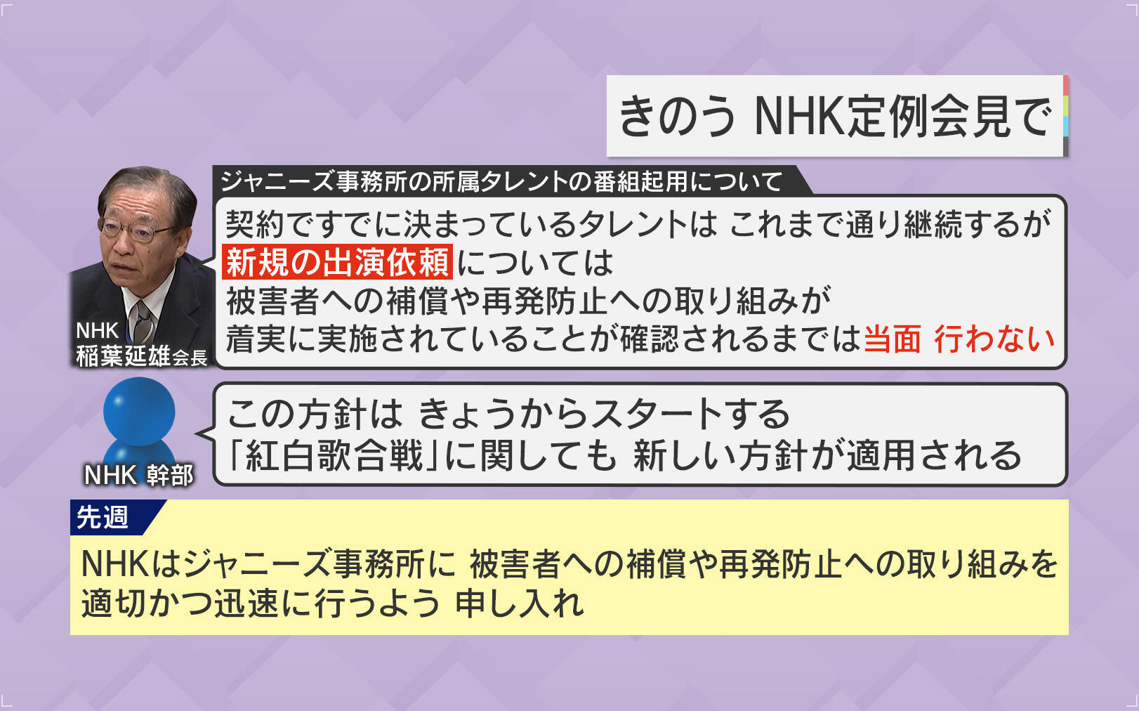 9月27日、NHKの稲葉延雄会長は、ジャニーズ事務所所属タレントの番組起用について「契約ですでに決まっているタレントはこれまで通り継続するが、新規の出演依頼については、被害者への補償や再発防止への取り組みが着実に実施されていることが確認されるまでは、当面行わない」と述べました。またNHKの幹部は、「この方針はきょうからスタートする。紅白歌合戦に関しても新しい方針が適用される」とコメントしています。NHKはジャニーズ事務所に被害者への補償や再発防止への取り組みを適切かつ迅速に行うよう申し入れています。