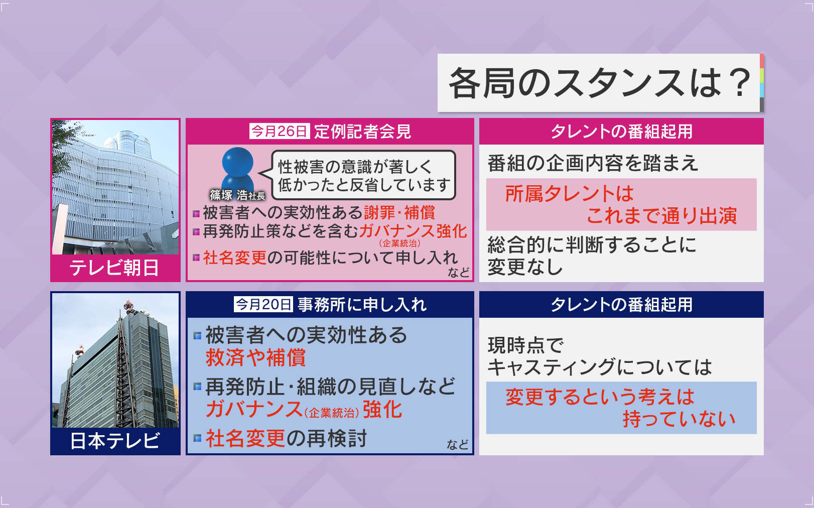 テレビ朝日は「性被害の意識が著しく低かったと反省しています」としたうえで「被害者への実効性のある謝罪・補償、再発防止策などを含むガバナンス強化、社名変更の可能性について申し入れしている」と話しました。タレントについては「性被害への意識が著しく低かったと反省しています。ジャニーズのタレントの皆さんの出演に関しては、タレントの皆さんに問題があるとは思っていないので、その都度 総合的に判断することに変更はありません」としています。日本テレビは「被害者への実効性のある救済や補償、再発防止・組織の見直しなどガバナンス強化、社名の変更の再検討などを申し入れた」とコメント、タレントについては「現時点でキャスティングについては変更するという考えは持っていない」としています。