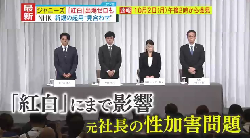 9月27日、NHKは、大みそかの紅白歌合戦についてジャニーズ所属タレントの起用を現時点では見送る方針を示しました。また、ジャニーズ事務所が10月2日の午後2時から会見をすると発表しました。今後の会社運営や再発防止策などを公表するということです。