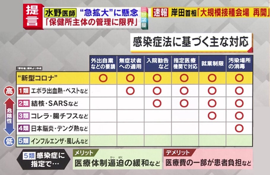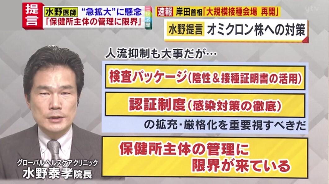 水野医師は、「人流抑制も大事だが、検査パッケージ(陰性・接種証明書の活用)と認証制度(感染対策の徹底)の拡充・厳格化を重要視すべき」と提言しています。また、保健所主体の管理に限界が来ているとも指摘しています。