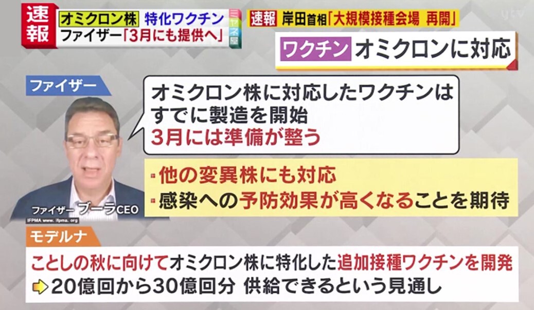 ファイザー社CEOは、「オミクロン株」に対応したワクチンについて、3月には準備が整うとの見通しを示しました。さらに「現行のワクチンよりも感染への予防効果が高くなることを期待している」と発表しています。