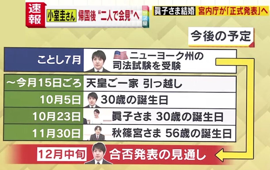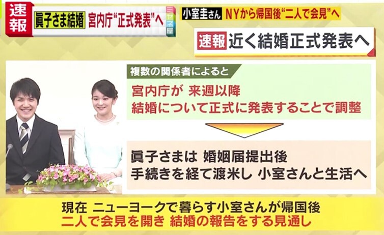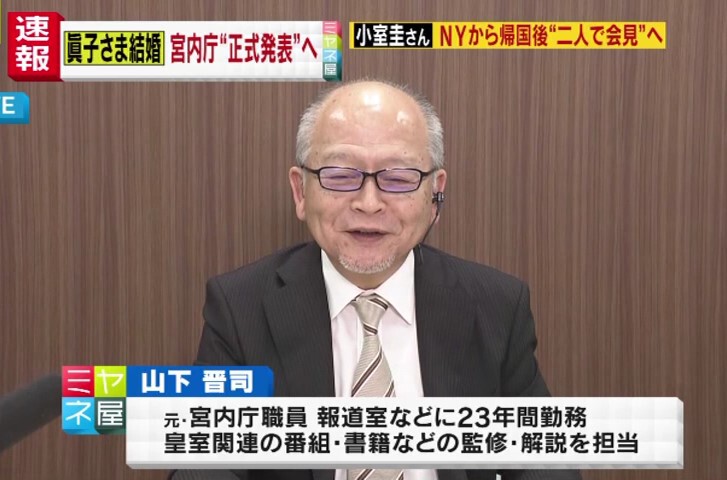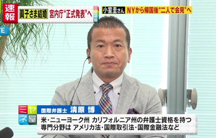 秋篠宮ご夫妻の長女眞子さまと小室圭さんとの結婚について、宮内庁が近く正式に発表する準備を進めていることがわかりました。小室さんの帰国後、お二人で記者会見を行う見通しです。元宮内庁職員の山下晋司(やました・しんじ)さんと、国際弁護士の清原博(きよはら・ひろし)さんが、今後の行方などについて独自解説しました。