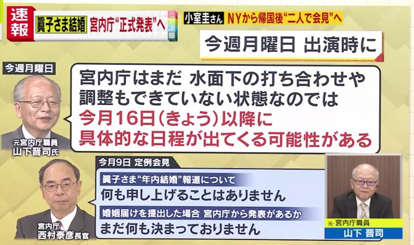 実は9月13日、元宮内庁職員の山下さんは「ミヤネ屋」に出演した際に「御所のお引越しが終わる9月16日以降に具体的な日程が出てくる可能性がある」と予想しており、まさにその通りになりました。