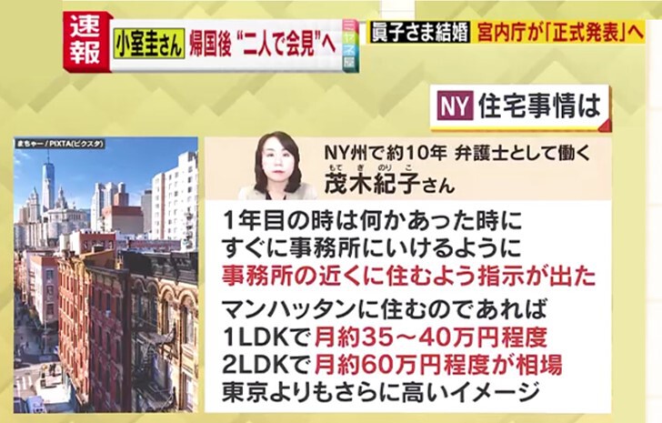 「家賃は高いですね。中心地のマンハッタンに住もうと思うと、本当にセキュリティのいい所ですと月50万円以上は軽くしますので、なかなか大変だと思います。そこは小室さんの収入との兼ね合いだと思うのですが、もし小室さんや眞子さまがマンハッタンから離れた郊外でもいいと仰るなら、また選択肢が広がっていくのではないかと思います」