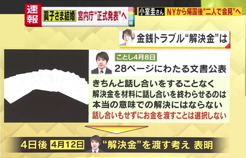 「その通りですね。やはり小室さんのほうから解決金を渡しますという提案をされても、いまだにお金の受け渡しがないということは、やはり受け取る理由がないといいますか。元婚約者の方が、お金が欲しいんじゃなくて、お母さんがあの時どういう気持ちでお金を受け取って、その後の婚約解消の時はどうだったかとかですね、そういういろんなことを話し合うことによって、2人の間でわだかまりがあるから解きほぐしたいと。それで、もしお金を受け取るなら受け取ります、ということなんだと私は思います」