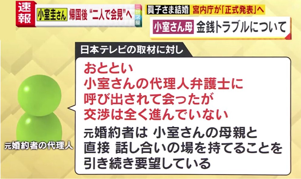 小室さんの母親の金銭トラブルについて、元婚約者の代理人は日本テレビの取材に対し「おととい小室さんの代理人弁護士に呼び出されて会ったが、交渉は全く進んでいない。元婚約者は、小室さんの母親と直接話し合いの場を持てることを引き続き要望している」と話しています。